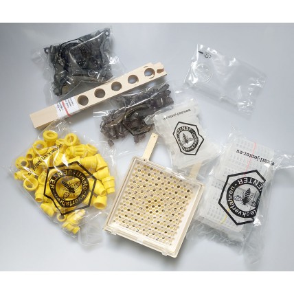 1x chovnou kazetu - rámek s mezistěnou, krytka s mateří mřížkou, zátka mateří mřížky, přítlačná deska matečníkových den