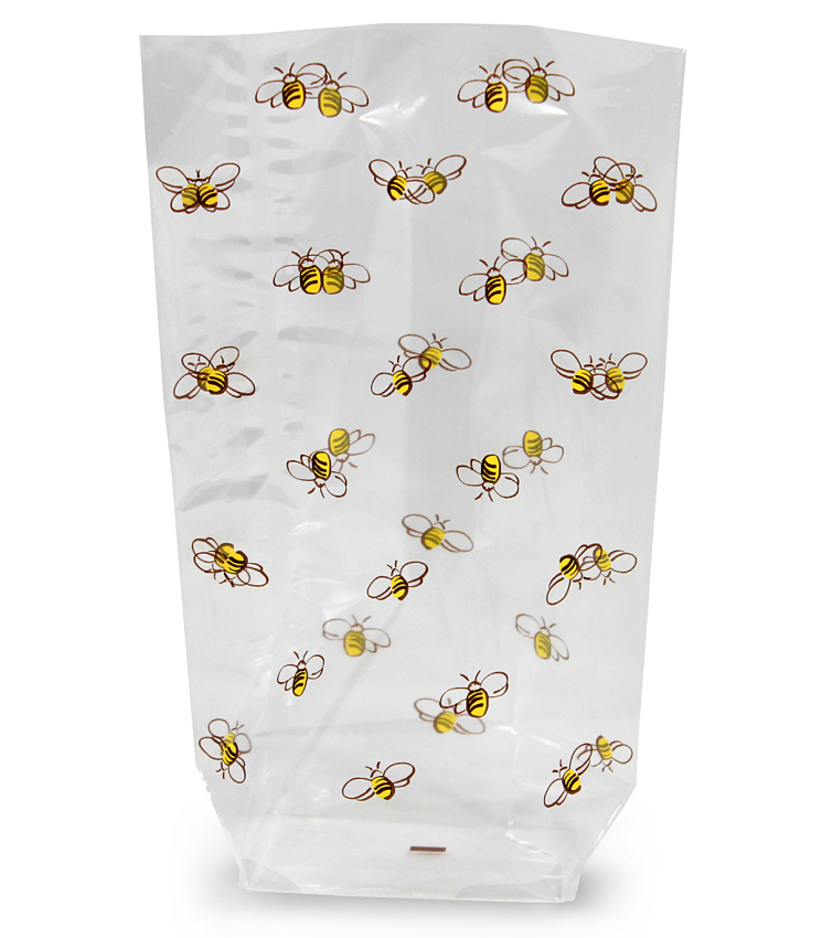 Průhledný dárkový sáček s včelím motivem vhodný na např. na 500 g sklenici medu.