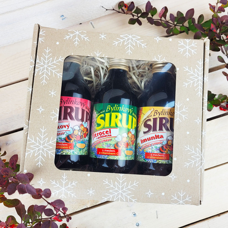 Tento vánoční dárkový balíček obsahuje tři přírodní bylinné sirupy s medem, které podporují imunitu a pomáhají při nachlazení.