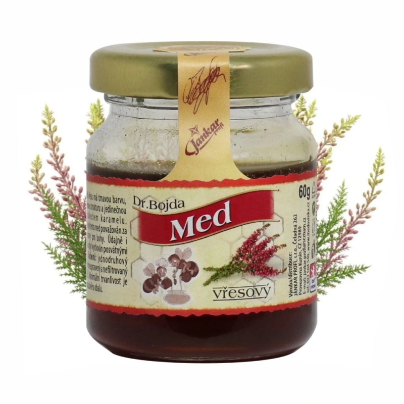 Složení: med jednodruhový květový vřesový 60g - země původu EU, bez přidaných konzervantů, barviv, nefiltrovaný med bez příměsi invertních sirupů a řepného cukru