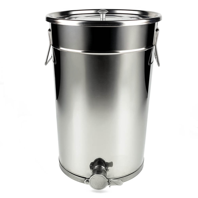 Kvalitní nerezová stáčecí nádoba na 50 kg (35 l) medu s nerezovým kohoutem a víkem s těsněním.