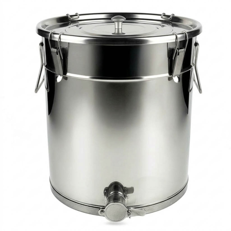 Kvalitní nerezová stáčecí nádoba na 80 kg (57 l) medu s nerezovým kohoutem a těsnícím víkem s těsněním.